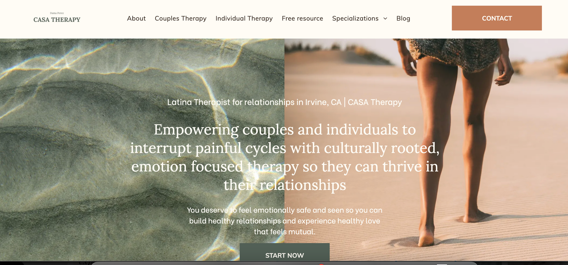 The website for CASA Therapy is a strong example of a couples therapy website designed around cultural awareness and relationship healing. Founded by therapist Dama Perez, the practice focuses on helping multicultural couples and first generation partners navigate communication challenges, conflict, cultural expectations, and major life transitions. The messaging immediately speaks to couples who feel stuck in repeating patterns and want to rebuild connection in a healthier way.