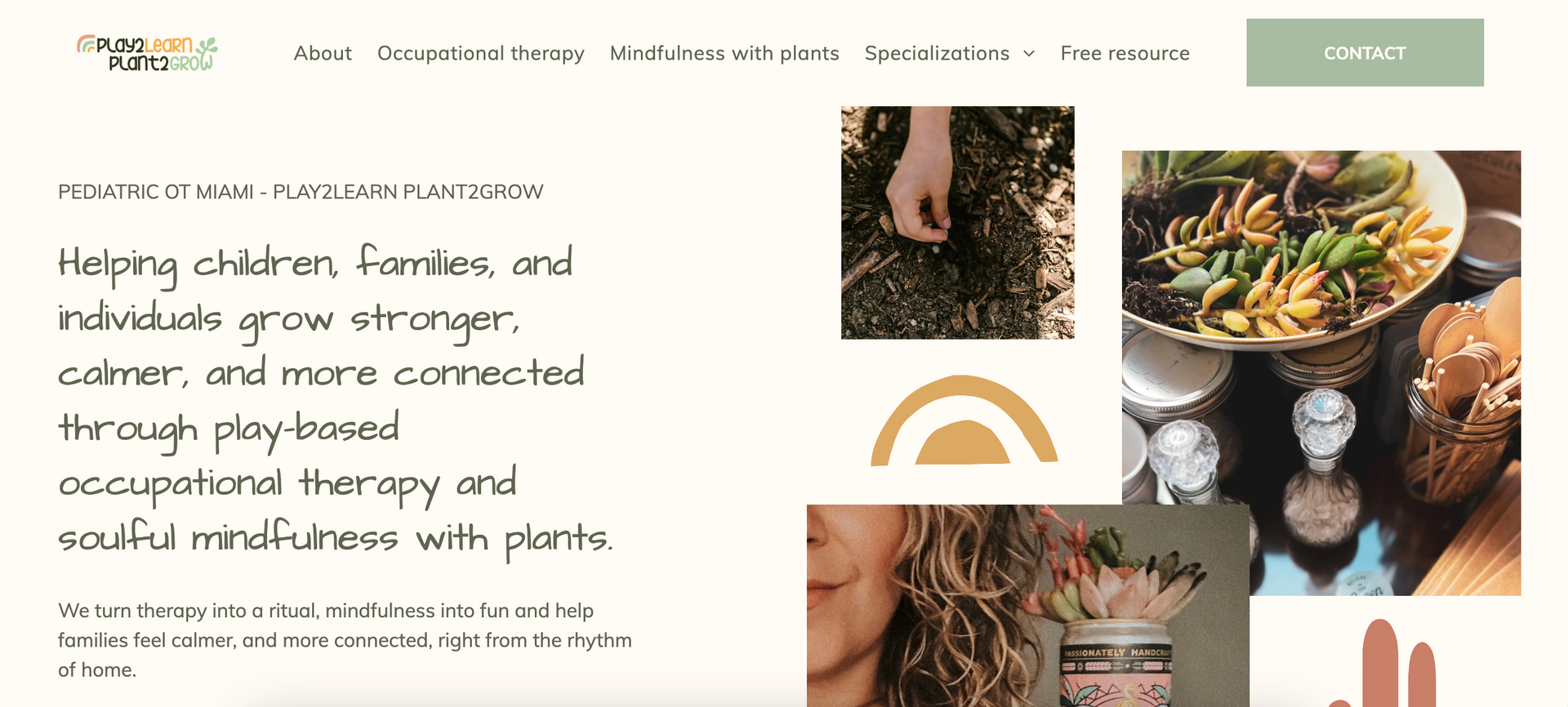 From a strategy perspective, the website clearly communicates Erika’s unique model by combining traditional pediatric occupational therapy with nature based mindfulness experiences and plant workshops. Services such as in home OT sessions, sensory integration support, and parent coaching are organized alongside community workshops that use planting and ritual as tools for emotional connection and creativity. This creates a website that highlights both therapeutic expertise and the broader vision of helping families grow stronger, calmer, and more connected.