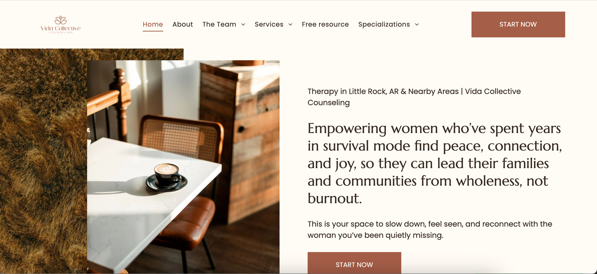 The website for Vida Collective Counseling is a great example of a group practice website built around a clear audience and compassionate messaging. Founded by Ana Alcacio Eldridge, the practice focuses on supporting women in Little Rock through trauma informed therapy, offering services in both English and Spanish to better support diverse communities.