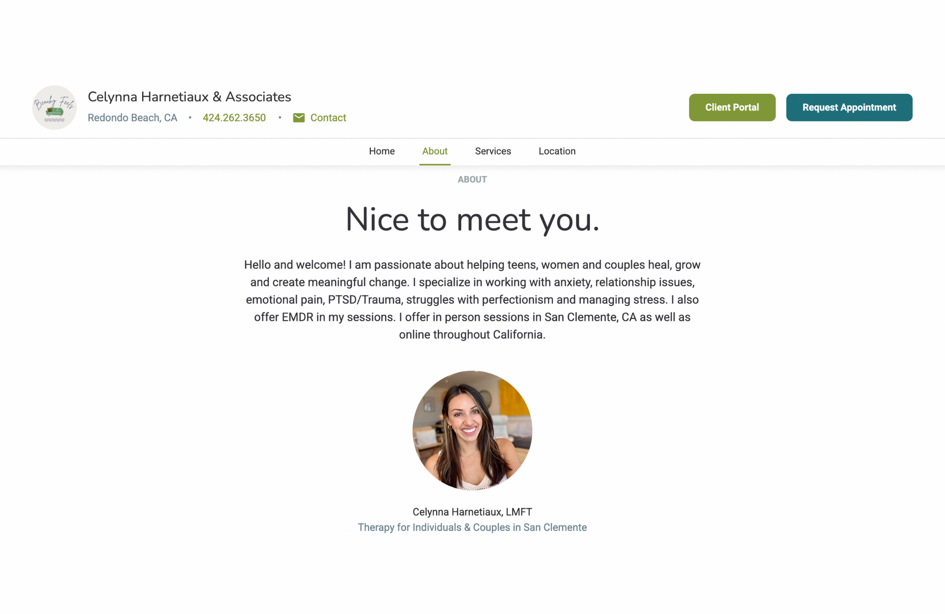 - Appointment scheduling integration – A website should make booking a session as easy as possible. Integrating scheduling tools like Simple Practice, or a CRM allows clients to book directly through your site, reducing barriers to working with you.
